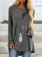 Super sød bluse med kat og fisk i bomuld, her i grå farve. Små i størrelsen vælg en størrelse større end du ellers ville gøre.