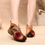 Unikke håndlavede skindstøvler i lysebrun med stor rød blomst, super soft og god pasform,