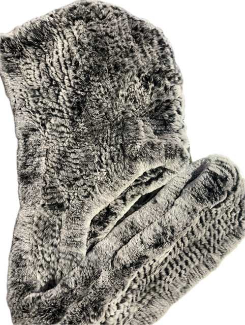 Eksklusiv hue i strikket sort rex kaninpels med halstørklæde. Halstørklædet er i et langt stykke og foldes over hovedet om halsen. Fåes også i sort med hvide spidser.