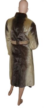 Pelsfrakke i natur sæl med stiklommer, hægtelukning og påsyet pyntebånd om livet i ruskind.