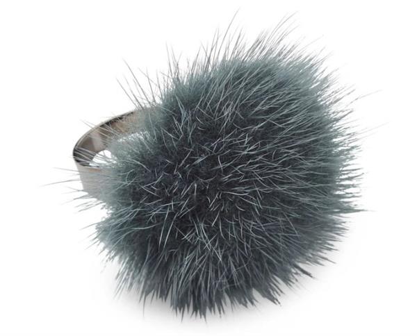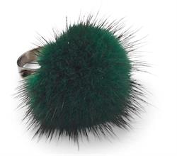 Fingerring med stor pompon af minkpels, ringen er justerbar, fås i flere farver, her grøn og mørkegrøn
