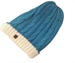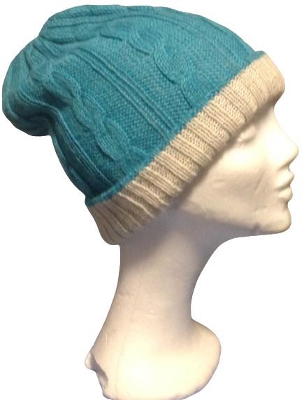 Huen er dobbelt-strikket og vendbar i farverne turkis og beige