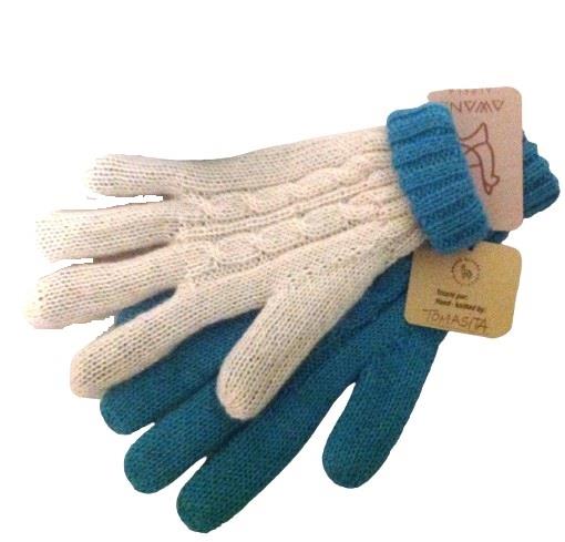 Vanterne er dobbelt-strikket og vendbar i farverne turkis og beige, naturfarvet og håndspundet.