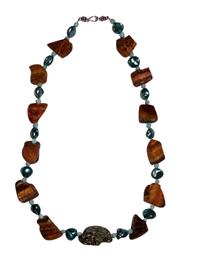 Unik halskæde med stor pyrit perle, rå tigerøje, store turkisgrønne ferskvandsperler, små facetslebne amazonite perler og sølv lås med filigran.