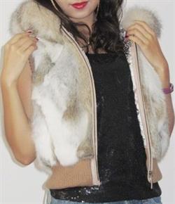 Kort blød kaninpels vest med for, hætte og lommer, lukkes med lynlås.