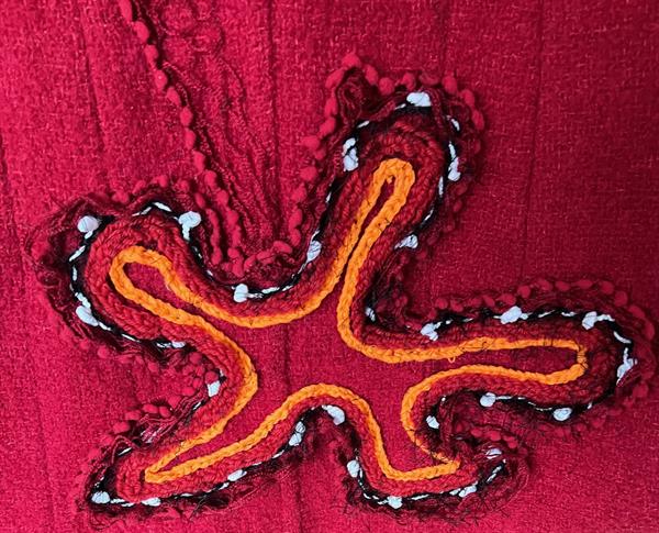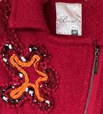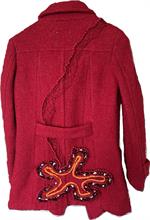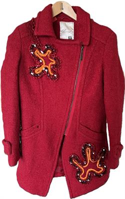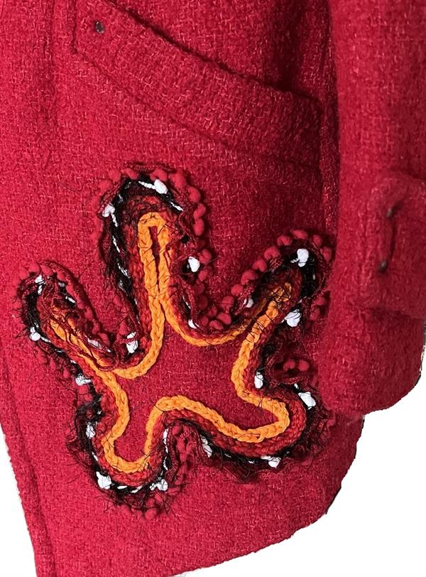 Upcyclet rød uld-frakke med håndlavede kreationer. fin stand og dejlig blød.
